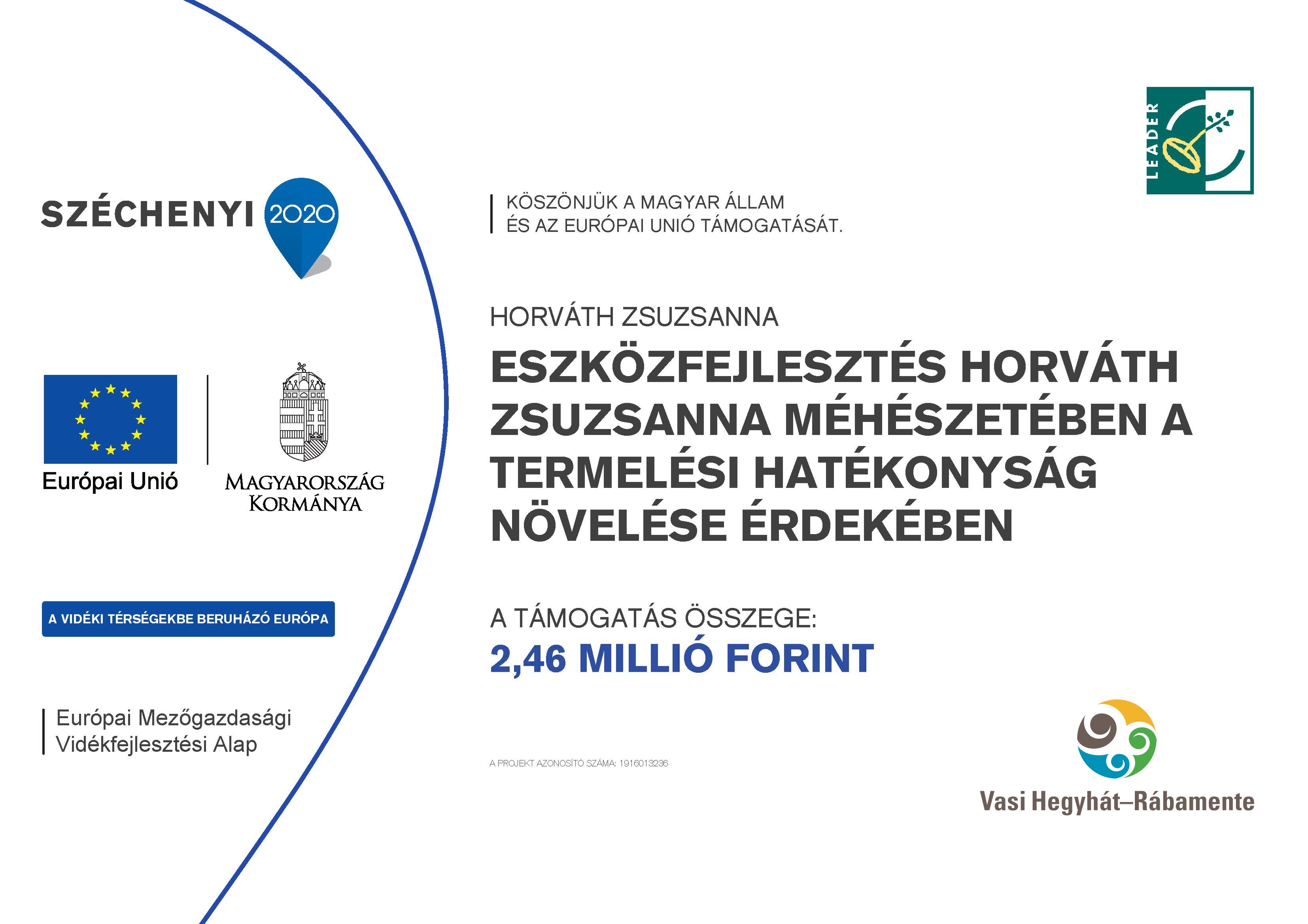 Örömmel tájékozatjuk Önöket, hogy vállalkozásunk újfent sikeresen pályázott a Magyar Államkincstár által meghírdetett LEADER Helyi Fejlesztésre, melynek keretében vállalkozásunk hatékonyságát növeltük eszközbeszerzések révén. Továbbá a páylázatnak köszönhetően tudunk már a tavalyi év óta krémesített mézet készíteni önöknek.